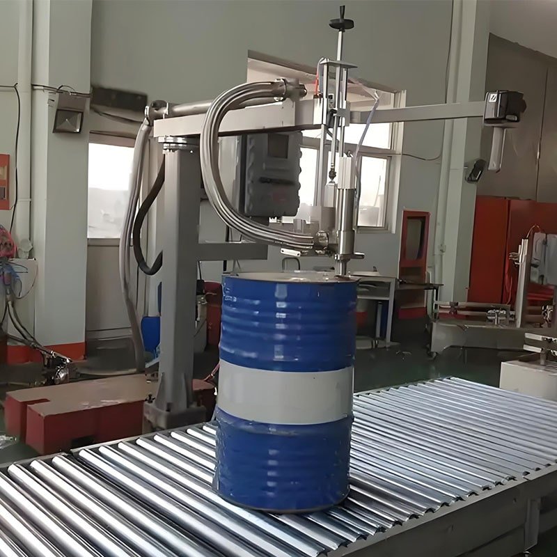 Power on the machine – Manually place the barrel onto the scale – Press the [Start] button – The filling head automatically inserts into the barrel opening – Automatic tare removal – The filling head and ball valve assembly automatically open to begin filling – Three-stage filling: large, small, and micro – When the target value is reached – The filling gun automatically closes and rises outside the barrel – Manually remove the barrel and lock the lid.