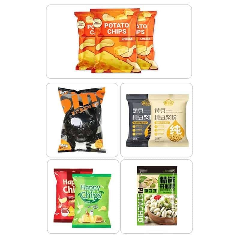 The machine is suitable for pack anomalous solid and the granule material, such as puff snack food, potato chips, crispy rice, jelly, candy, apple chips, dumpling, small cookies, dry fruit, melon seeds, roasted seeds and nuts, medical material, deep frozen food, etc.