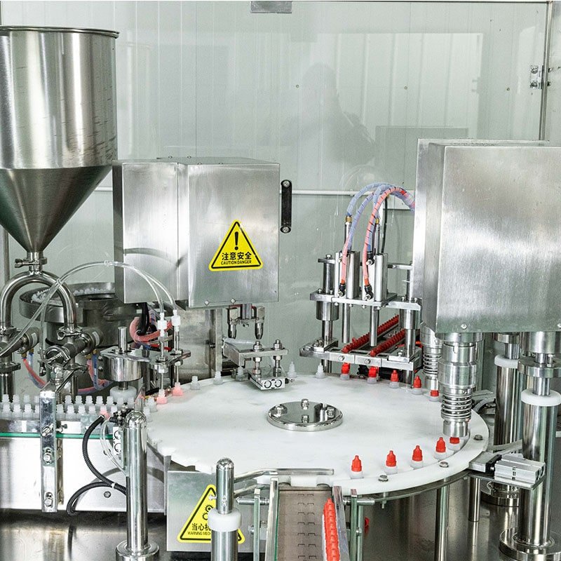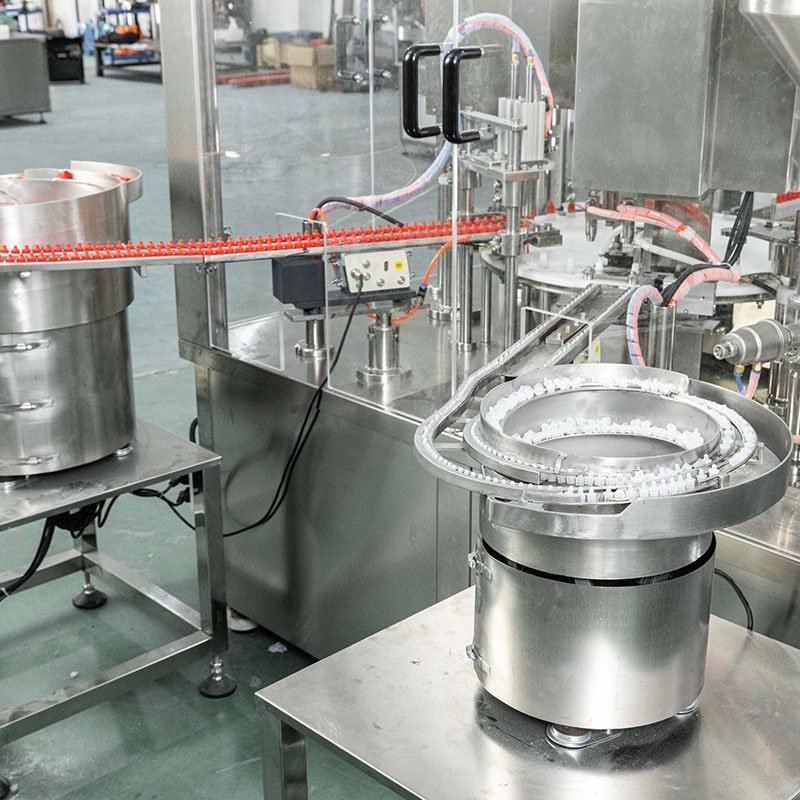 This machine is mainly used for bottle, plug or stopper and cap three-piece automatic solution filling, automatic inner plugging, automatic capping; This machine adopts linear conveyor belt to feed the bottles, positioning in the disc for filling in stages, from the plug and plug hopper to automatically arrange and transfer to the plugging and capping position, and the manipulator performs directional plugging and capping, precise positioning and no error.